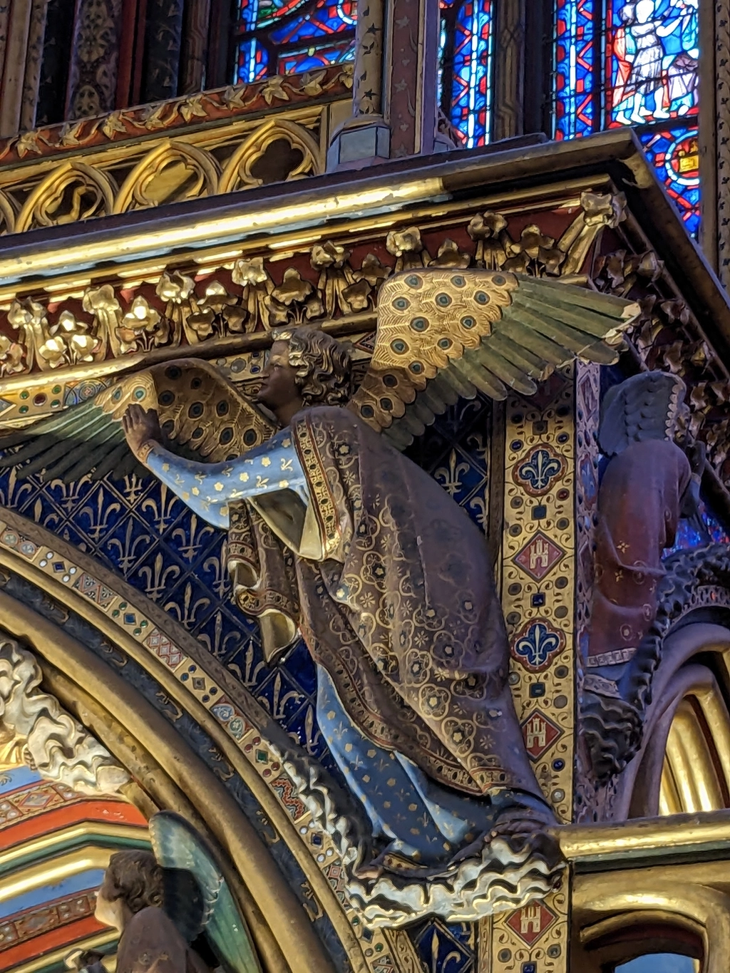 走進聖禮拜堂,你會發現建築分為上下兩層:下層禮拜堂原本供宮廷職員使用,樑柱間的藍金色彩與簡約裝飾,顯得樸實;而上層禮拜堂則是王室專屬,挑高空間、壁面幾乎全是絢麗的彩繪玻璃。這些玻璃窗面積近 600 平方公尺,描繪著聖經故事,陽光灑落時,整個空間彷彿浸泡在五彩斑斕的光海裡。